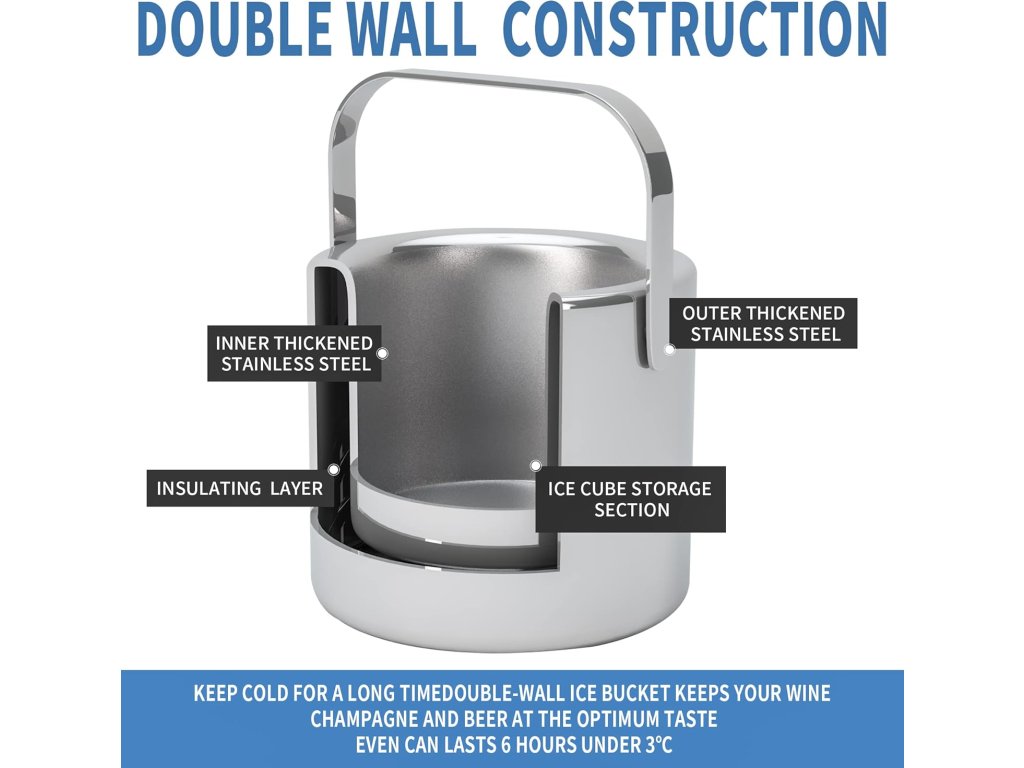 - Dlouhotrvající mrazení: Dvouvrstvá konstrukce z nerezové oceli a vzduchotěsné víko udrží ledově chladné, zabraňují kondenzaci a snižují vlhkost nebo mokré skvrny na jakémkoli povrchu. Nerezový kbelík na led udrží nápoje nebo ovoce studené a čerstvé.