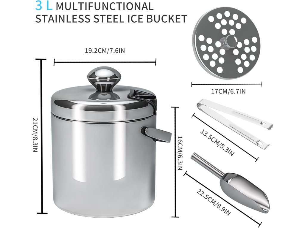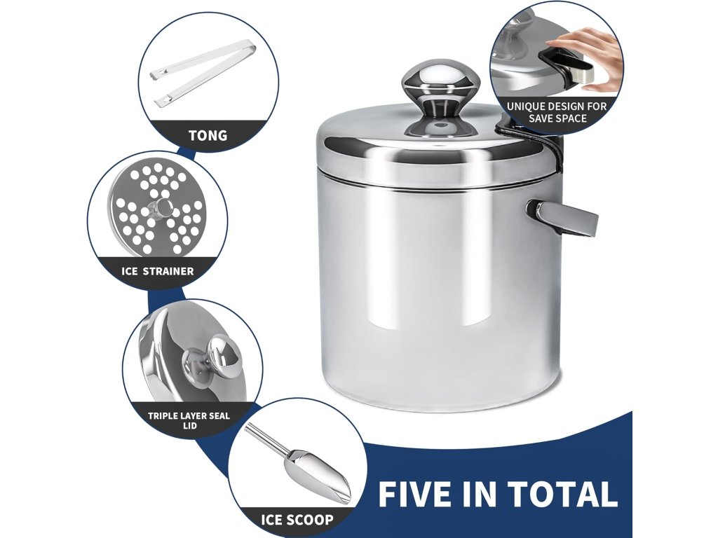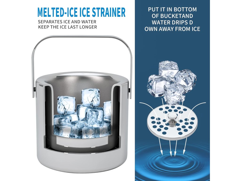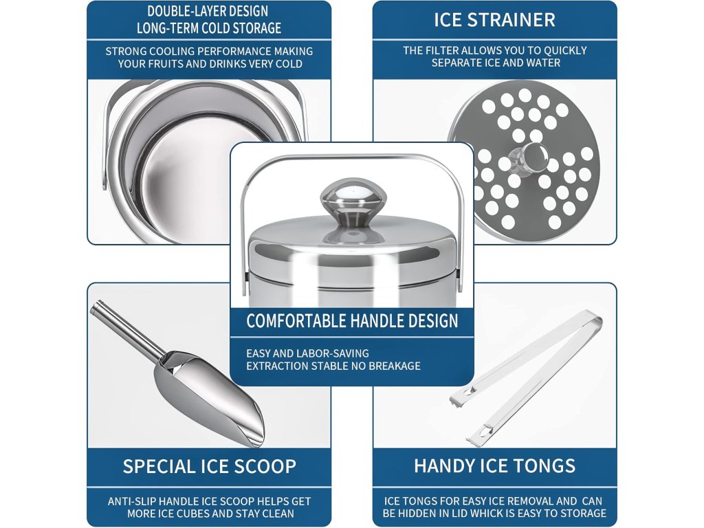 - Unikátní design: nerezový kbelík na led se skládá z kbelíku na led, filtru, kleští na led, naběračky na led a krytu kbelíku na led. Má celoocelové držadlo pro snadnou přepravu. Kleště na led jsou skryté v náplňové vrstvě a nezabírají místo, takže je snadné uchopit kostky ledu. Vestavěný filtr se nachází ve spodní části kbelíku na led, aby lépe odděloval ledovou vodu a kostky ledu déle skladoval.