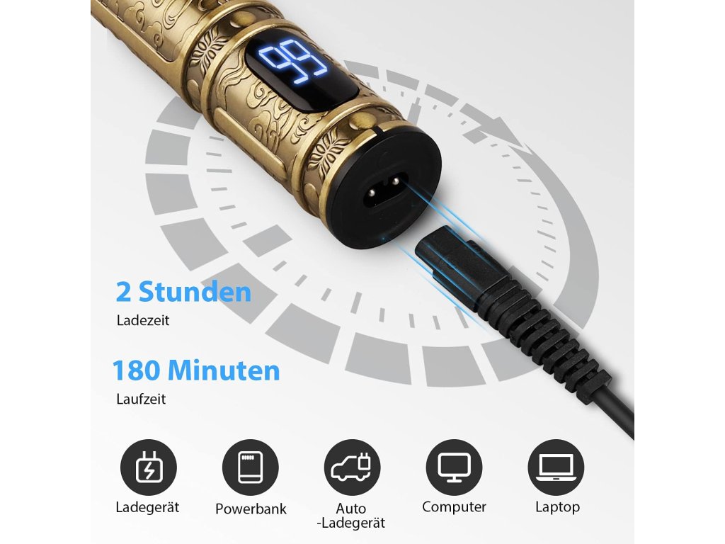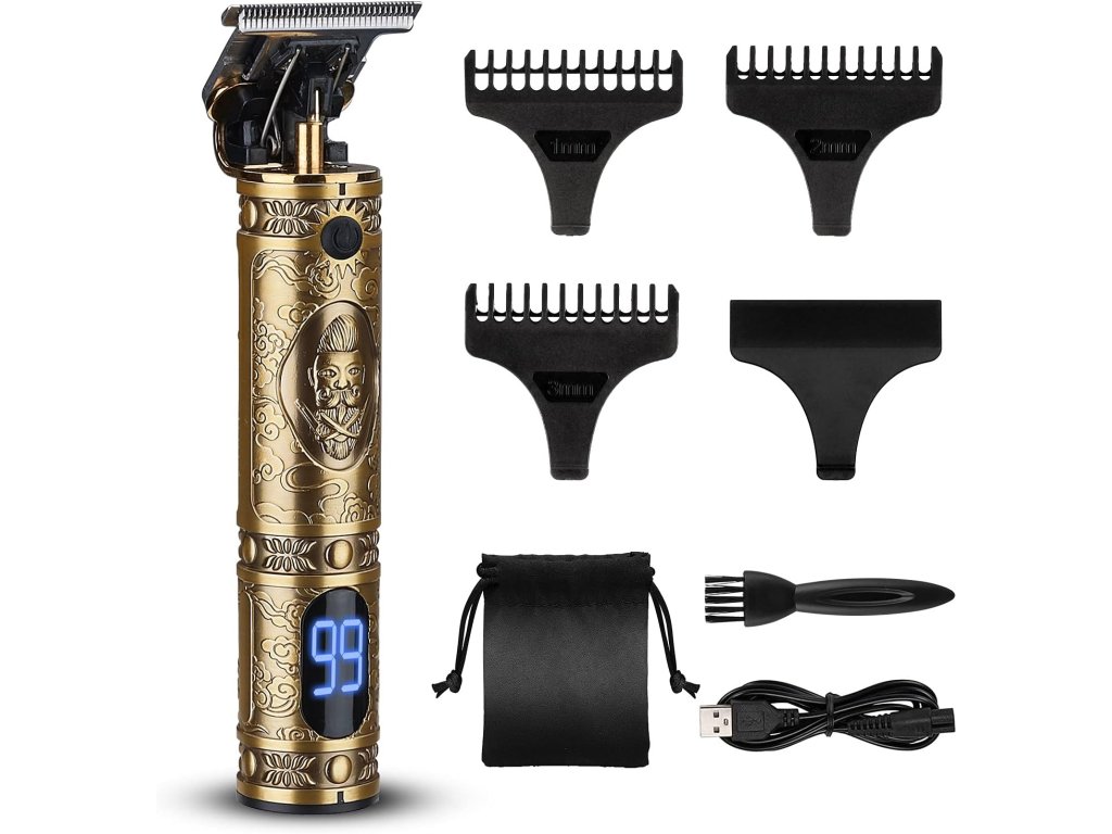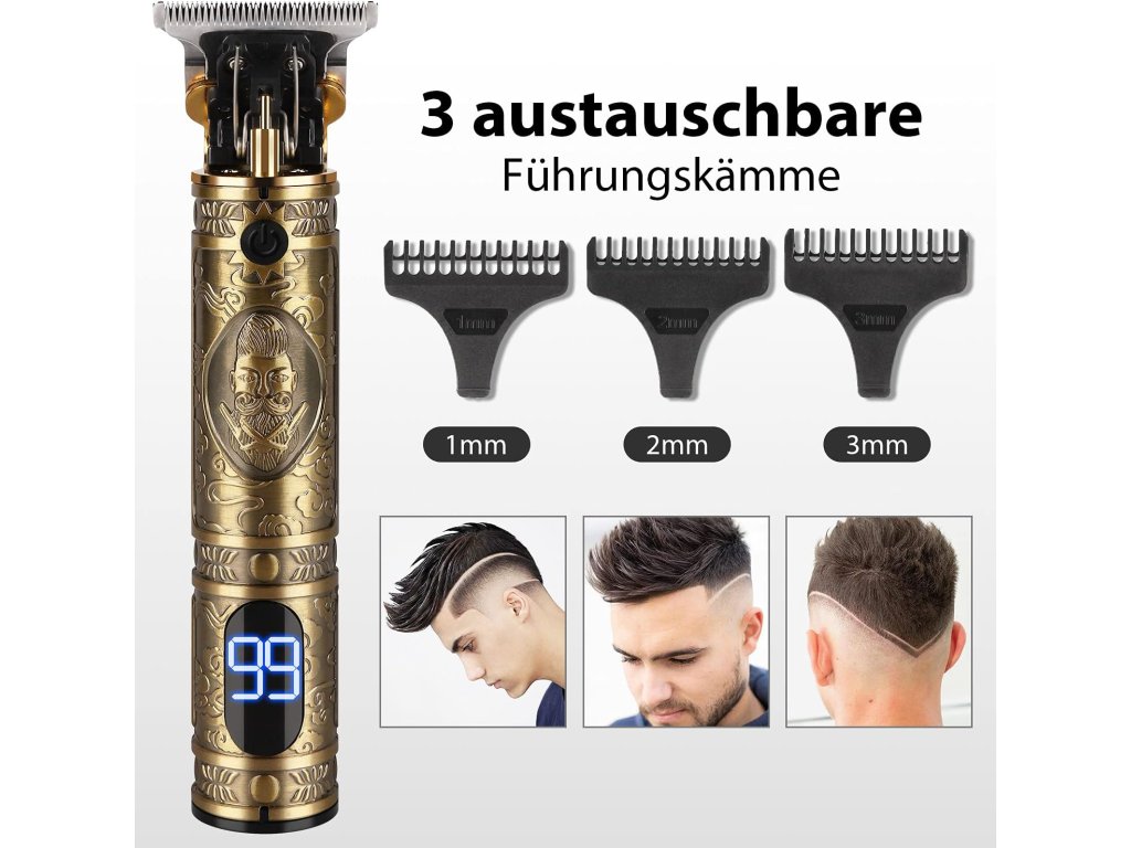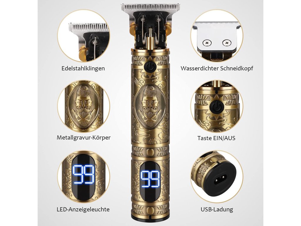 Profesionální pánský zastřihovač vousů kombinuje funkčnost a styl na vysoké úrovni s vysokým výkonem, hladkým střihem a krásným zlatým řezbářským designem. Tento multifunkční zastřihovač vousů má vestavěný LCD displej a dobíjecí baterii s kapacitou 1500 mAh s velkou kapacitou, díky čemuž vynikne. Díky ergonomickému bezdrátovému designu a 180 minutám provozu je tento elektrický zastřihovač vousů pro muže nezbytností pro rychlé a efektivní zastřihování vousů.
